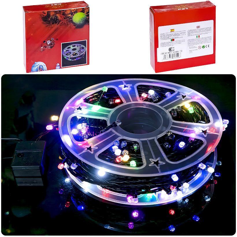 Гірлянда електрична 50 метрів. Колір світіння ламп - мультиколор (червоний, синій, зелений, жовтий) мініконтролер 8 програм світіння, прозорий плафон на діоді. Колір дроту - чорний. Живлення - 220V.